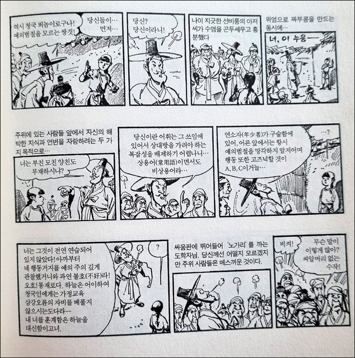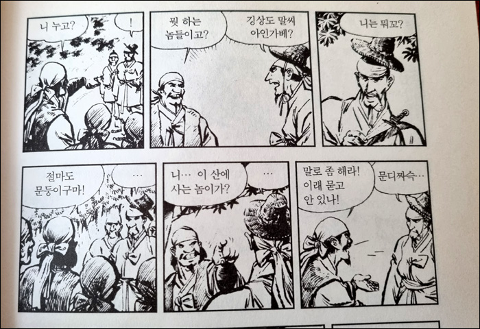 일례로 아래 만화 컷에서 사투리를 빼면 얼마나 밍밍하겠는가. 『임꺽정』만이 아니라 『일지매』에도 등장하는 수많은 평안도·함경도·경상도·전라도 사투리는 만화를 읽는 재미와 현실감을 배가 시키는 중요한 요소였다.